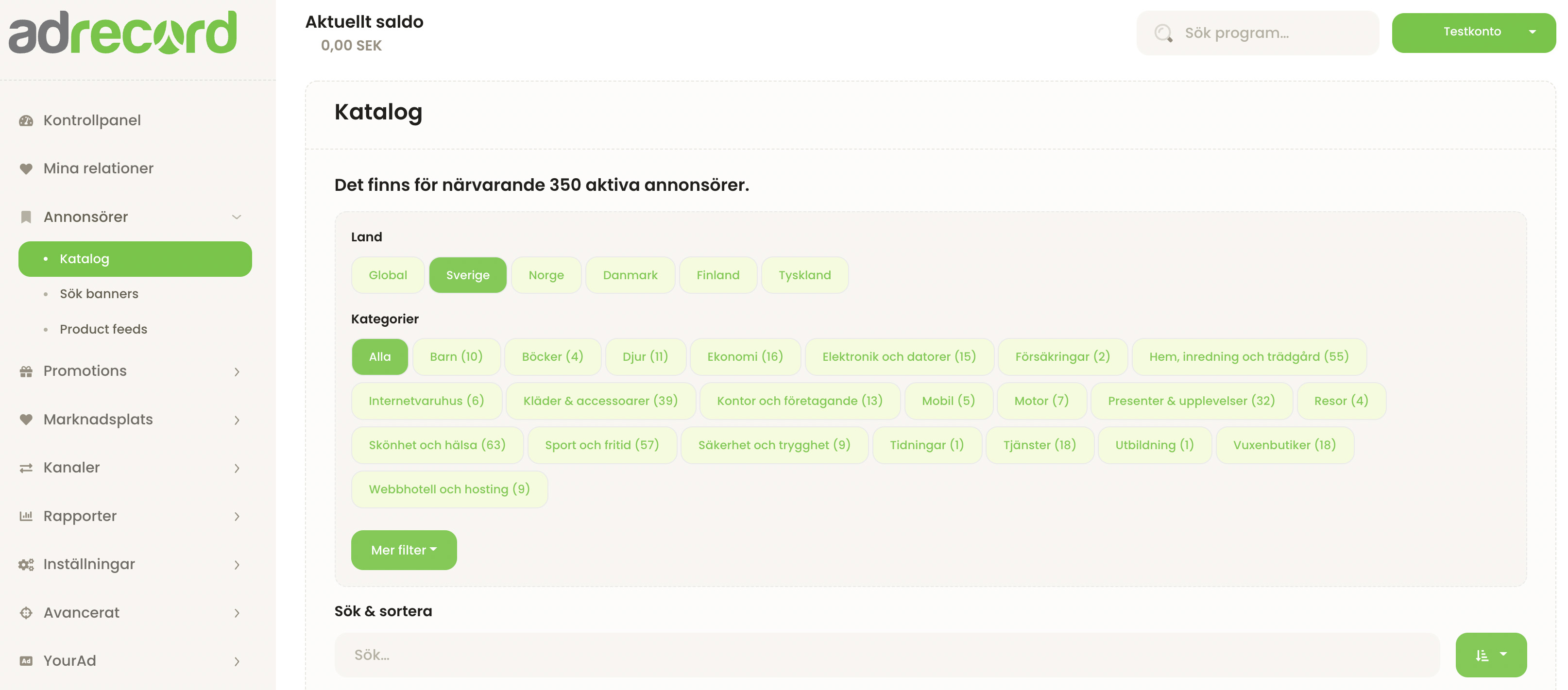 Då du har registrerat den kanal (webbsida eller blogg) där du vill lägga upp reklam är det dags att välja en annonsör. Det gör du i programkatalogen som du kommer åt i menyn under Annonsörer -> Katalog. Klicka på den annonsör du är intresserad av så kommer du till annonsörens programsida. Exempelvis Svenskt Kosttillskott eller Avanza.